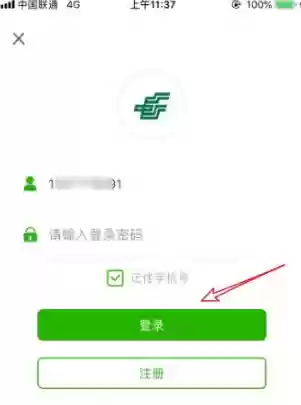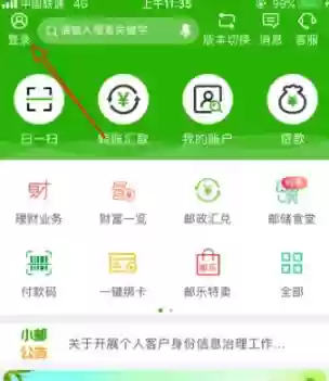 首先,您需要打开邮政银行官方APP,接着点击首页左上方的登录入口,具体位置如下图所示