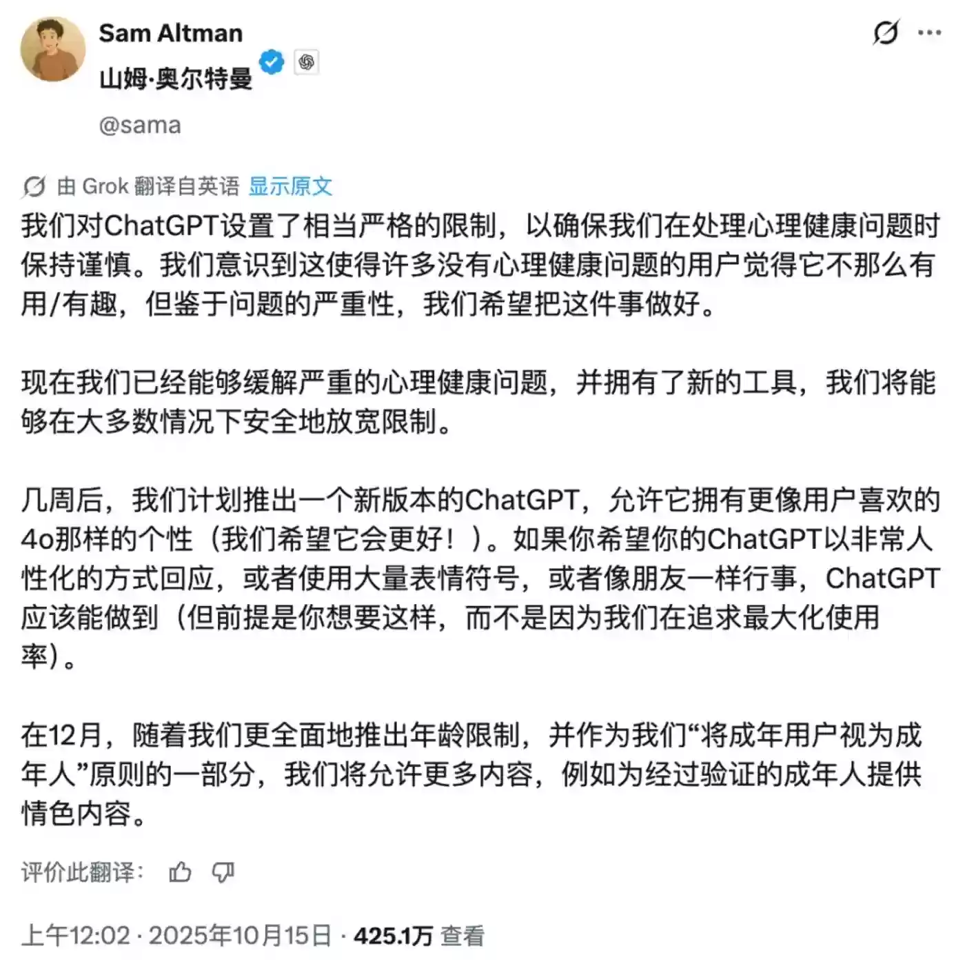 但这并未平息这场风波。"为什么年龄门槛总是针对情感内容?我只是希望被当作成年人对待,而不是像对待孩子那样被过度保护,但这绝不意味着我想要被激活所谓的变态模式。"一条高赞留言这样写道,而奥特曼的回应是:"除非你主动要求,否则你不会得到它。"