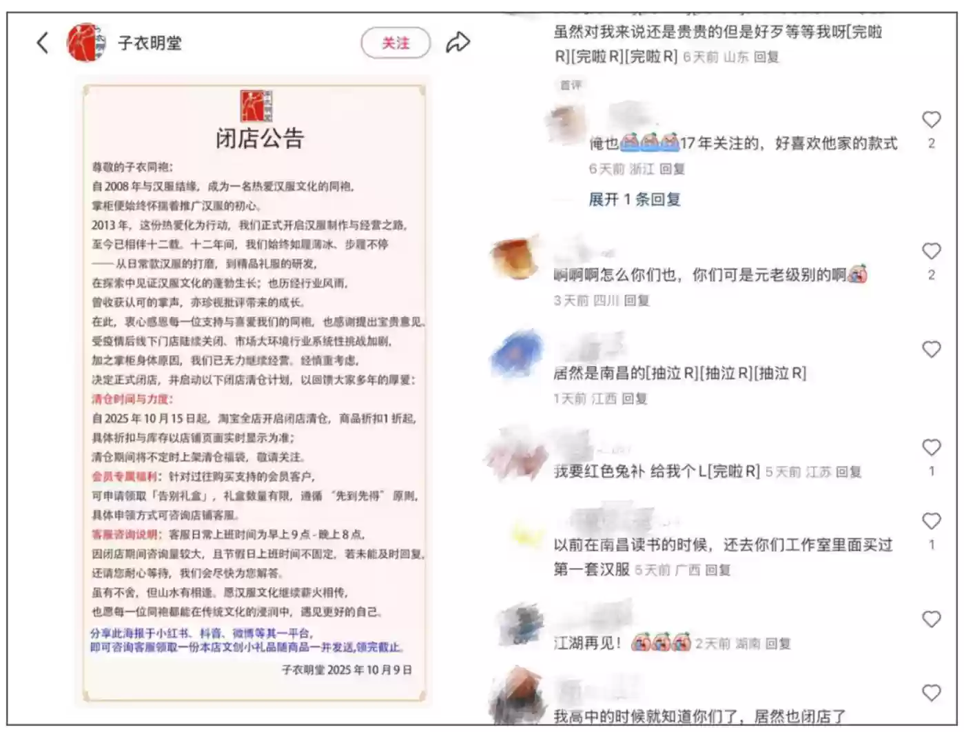 不单单是"子衣明堂",日前,一家7年老店"明镜华服"同样公告,将于2025年11月7日闭店。该店在淘宝仍有超21万粉丝。