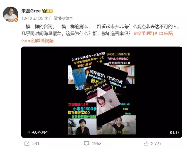 10月21日,网络上传出消息称,两天前的晚间,格力电器市场总监朱磊在个人微博曝光了多位博主关于小米与格力1.5匹空调价格对比的短视频内容,并对这些视频中“几乎一模一样的台词、相似脚本、接近同时大量覆盖”的做法提出质疑。