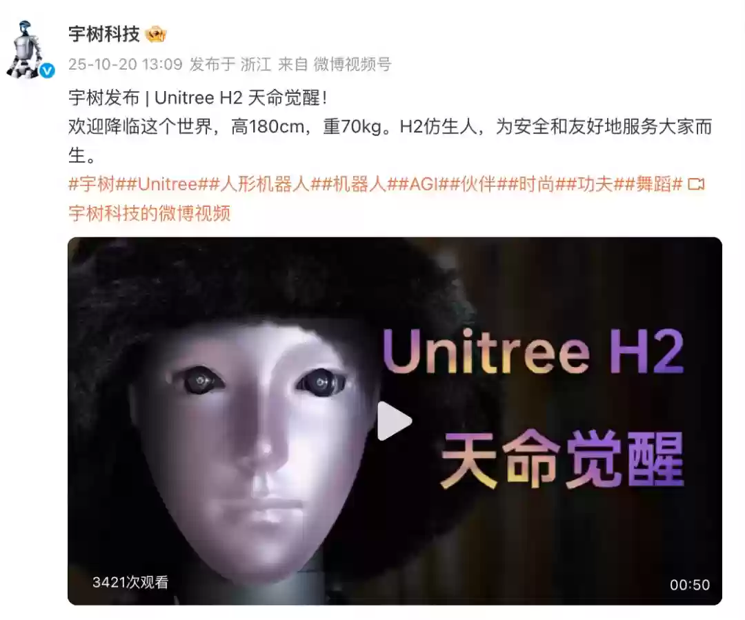 10月21日,宇树科技正式发布H2仿人形机器人。这款机器人身高180厘米,体重70公斤。虽然具体型号配置尚未公布,但从现场演示视频来看,新一代产品在灵活性和稳定性方面都有显著提升,不仅能够流畅地进行舞蹈表演、武术展示,还能身着时装化身模特走秀,各类动作都展现出行云流水般的自然流畅度。