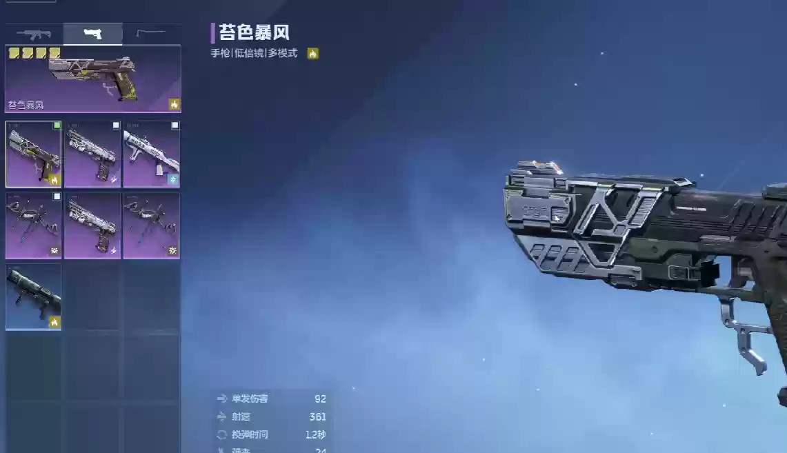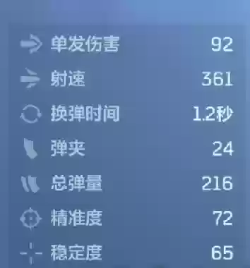 青色暴风在游戏中定位为低倍镜手枪,主要担任副武器角色。其单发伤害达到92点,射速为361,换弹时间为1.2秒。弹匣容量为24发,总备弹量为216发。这把枪的精准度与稳定性相当出色,在手枪类别中表现突出,两项数值分别达到72点和65点。