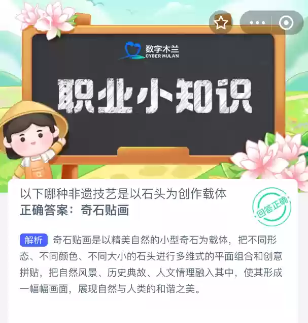 猜猜看,哪种非遗技艺是以石头作为创作载体?【蚂蚁新村每日一题】2025年10月20日题目现已公布!坚持答题,积累木兰币,就能加速小镇建设。答对本道题,马上就能享受“产速+3/时”的加速奖励!今日的正确答案是【奇石贴画】。奇石贴画是以精美自然的小型奇石为载体,将形态各异、色彩丰富、大小不一的石头进行多维度的平面组合与创意拼贴。