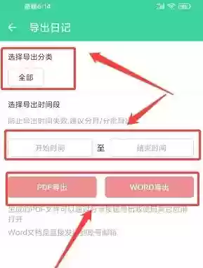 4、进入导出日记界面,选择导出分类、设定导出时间段,并选择导出方式,完成导出操作。