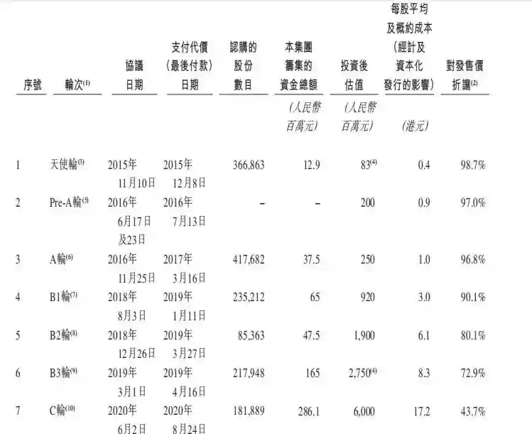 具体来看,天使轮投资者的每股成本仅为0.4港元,Pre-A轮和A轮的每股成本分别为0.9港元和1港元;B轮投资者的入股成本则从B1轮的3港元,攀升至B4轮的8.3港元;到C轮投资者入股时,每股成本已达到17.2港元。