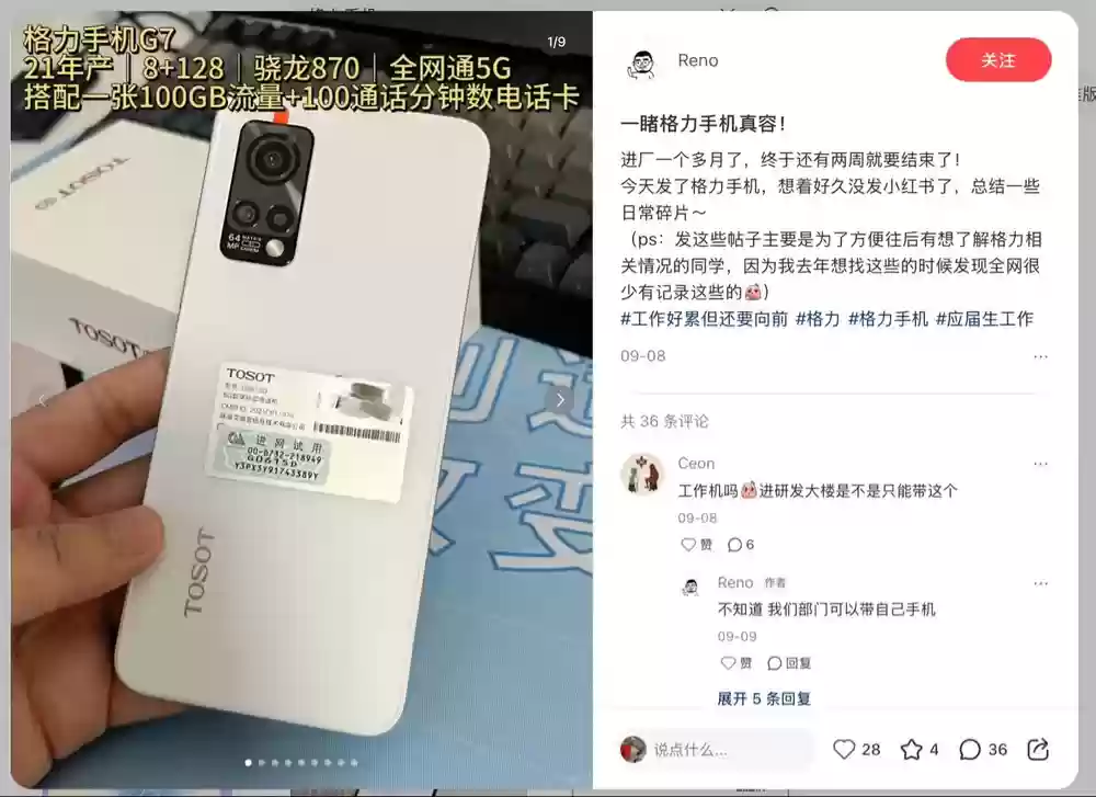 10月21日消息,近日多位自称"格力员工"的网友在社交平台发文,晒出格力最新发放的内部手机。根据相关图片显示的机型信息,这款手机预计正是格力计划于2024年11月发布的TOSOT大松G7。