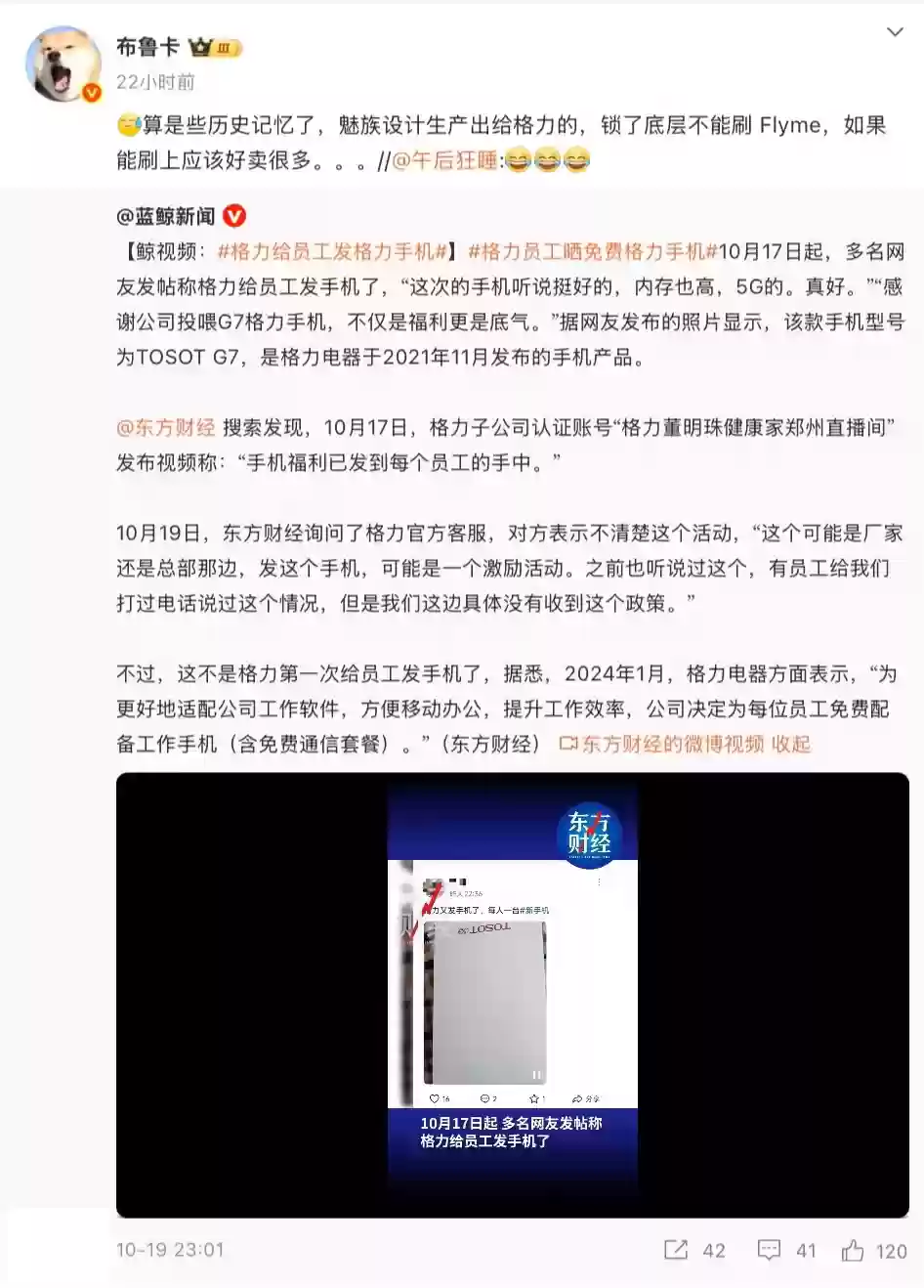 而魅族科技员工@布鲁卡转发了相关微博,称该机型实为魅族为格力设计生产的定制机型,但由于系统底层锁定,无法刷入Flyme操作系统。