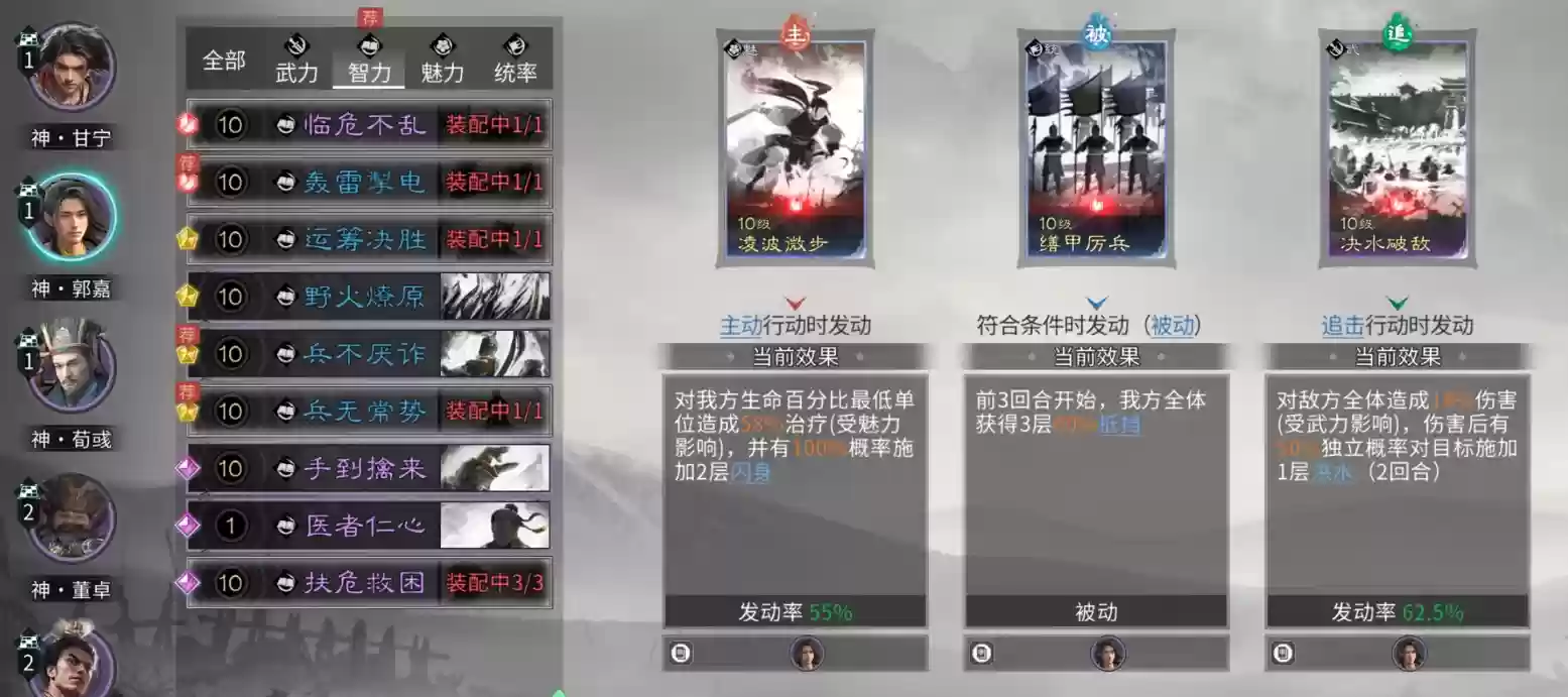 在游戏初期开荒时,奶妈角色必不可少。如果没有治疗型武将,前期战斗难度会显著增加。由于初期粮草资源有限,使用资源时一定要精打细算。这里推荐一套在抽卡资源不多的情况下可以考虑的组合:蔡文姬+董卓+张辽的搭配。这套国家队的定位主要是秒杀后排,能够针对敌方的核心输出角色进行打击。当然,如果无法抽到以上三位武将,还有另一套备选方案:黄月英+诸葛亮+赵云的组合。