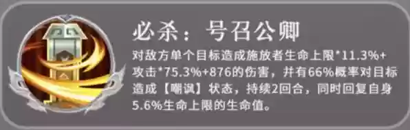使用这个角色时,首先要注意他的必杀技"大招"。该技能能对单个目标造成可观的伤害,具体数值由袁绍最大生命值的11%加上攻击力的75%,再附加876点固定伤害。这样综合计算下来,实际造成的伤害其实并不比一些纯输出角色低。更重要的是,该技能有66%概率对目标施加嘲讽状态,同时还能为自身回复约5.6%最大生命值的血量。虽然在奶量充足时这个回复效果显得一般,但在治疗紧张的情况下,这点恢复往往能救急保命。