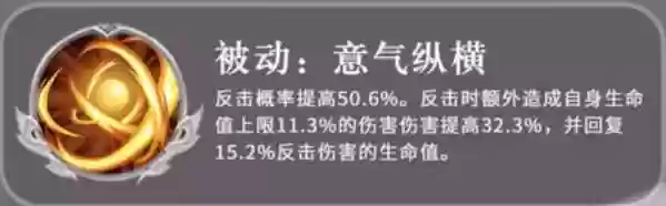 他的被动技能"意气纵横"与反击效果紧密相关。触发被动时,反击概率会提升50%,并且反击还能额外造成目标最大生命值11%左右的伤害。这里的伤害还可以再提升约32%,同时伴随的是自身的恢复效果——会根据反击伤害的15%来回血。也就是说,大家用他的反击效果越厉害,他自身恢复的生命值比例就越高。
