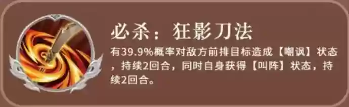 颜良的核心优势在于嘲讽与反击的完美结合。作为防御武将,首先要关注他的第一个必杀技“狂影刀法”——这个技能有大约39%的概率对前方一排敌人施加嘲讽状态,持续时间长达两个回合。同时,颜良自身会获得"叫阵"状态,这个增益效果不仅能强化自身属性,同样会持续两个回合。