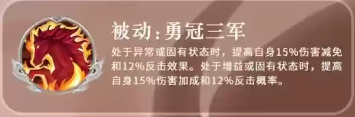 最后的被动技能"勇冠三军"是在颜良受到敌人负面状态影响时触发的。此时颜良会运用"勇冠三军"这个技能,为自身提升15%的伤害减免效果,同时带来12%的反击概率。如果他是处于增益状态或固有状态中的话,这个效果还会提升他自身15%的伤害,而12%的反击概率也能给对手带来更多的战术压制。