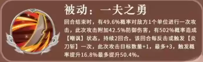 他的被动技能"一夫之勇"会在每个回合行动结束后触发,其中约49%的概率触发成功。此时不仅能对一名敌人造成额外攻击,这次攻击还会带来防御类型的伤害,数值达到42%左右。更关键的是,还有约500%的概率可以再次施加嘲讽状态。在这个回合中,只要触发了反击或者烟刀斩效果,这次攻击的敌人数量就会增加到最大值,同时额外将三个目标全部覆盖到。触发这个被动技能的概率还会提升到16%左右,最多情况下触发概率可达50%。由此可见,他确实是一位兼具双重触发机制的优秀武将。