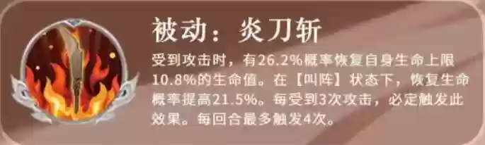 第二个被动技能"炎刀斩"是在颜良受到攻击时触发的效果。游戏中这个技能有26%的概率恢复他自身一定的生命值,恢复数值达到了10%左右。这个被动技能其实与主动技能中的"叫阵"状态紧密相关——当触发被动时,如果颜良身上有叫阵状态,此时的生命恢复概率还会提升21%左右。值得注意的是,每当颜良受到三次攻击后,这个技能必定会触发,而且每个回合最多可以触发4次左右。所以颜良本身的生存能力是相当可靠的。
