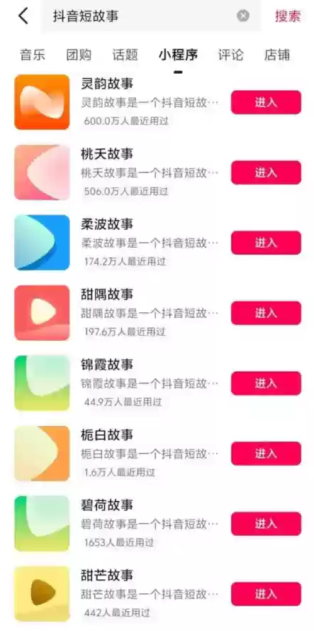 在抖音App内搜索"抖音短篇故事",即可在小程序专区看到字节旗下多款短篇故事产品。搜索结果显示目前已有20余款相关小程序,根据最新页面数据,这些小程序的使用人数从数百到数百万不等。更值得注意的是,平台还在持续增加新的短篇故事产品。