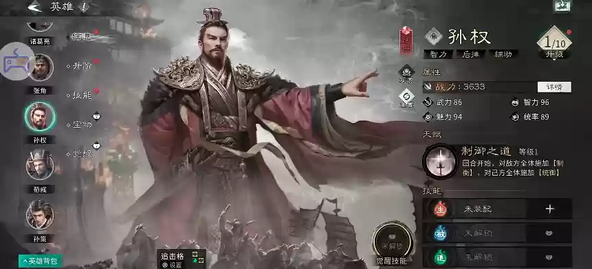 如果大家选择玩文武制衡队,第一个推荐的核心武将是孙权。作为该阵容的绝对核心,他的天赋效果「治愈之道」能够在战斗中持续叠加我方阵容的思维属性。这个属性对战斗效果影响显著,不仅可以扰乱对手,还能在整体数值上形成优势。当孙权升级至蓝色品质时,队伍的思维属性将获得更大提升。建议优先将孙权培养到这个强度,再使用这套阵容。