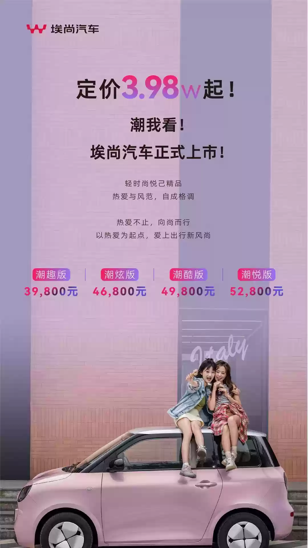 埃尚品牌自诞生之初便聚焦于人工智能、5G通信、大数据与汽车制造的深度融合,依托全链条制造体系和全球化服务理念,持续推动产业向新质化、智能化及绿色化转型。品牌以“热爱、自信、进取、愉悦”为核心价值主张,深耕经济型新能源乘用车领域,特别是在A00级、A0级和A级细分市场持续发力,致力于打造覆盖多元需求的产品矩阵。