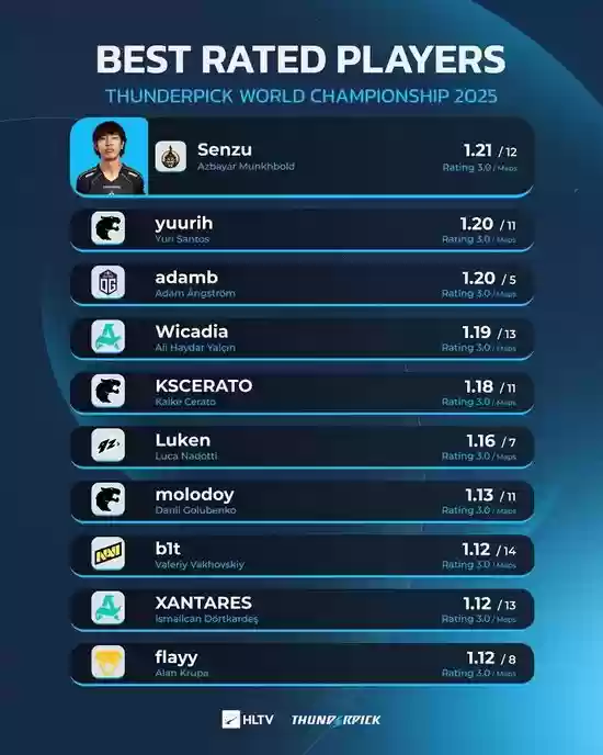 位列第二的是冠军战队选手yuurih,他在11张地图中打出了1.20 rating的优异成绩。在TOP5选手中,FURIA战队共有三人上榜,KSCERATO在11张地图中取得1.19 rating位列第5,而狙击手molodoy则以1.13 rating位居第7名。