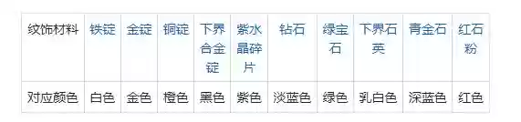不同的纹饰材料会赋予盔甲不同的颜色效果,可选用材料包括铁锭、金锭、铜锭、下界合金锭、紫水晶碎片、钻石、绿宝石、下界石英、青金石或红石粉,具体对应颜色如下表所示: