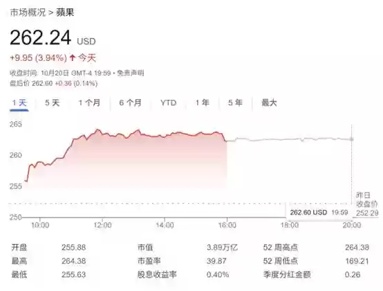苹果股价周一迎来大涨,盘中一度冲高至264.38美元的历史新高。截至收盘,涨幅达3.94%,报收于创纪录的262.24美元。