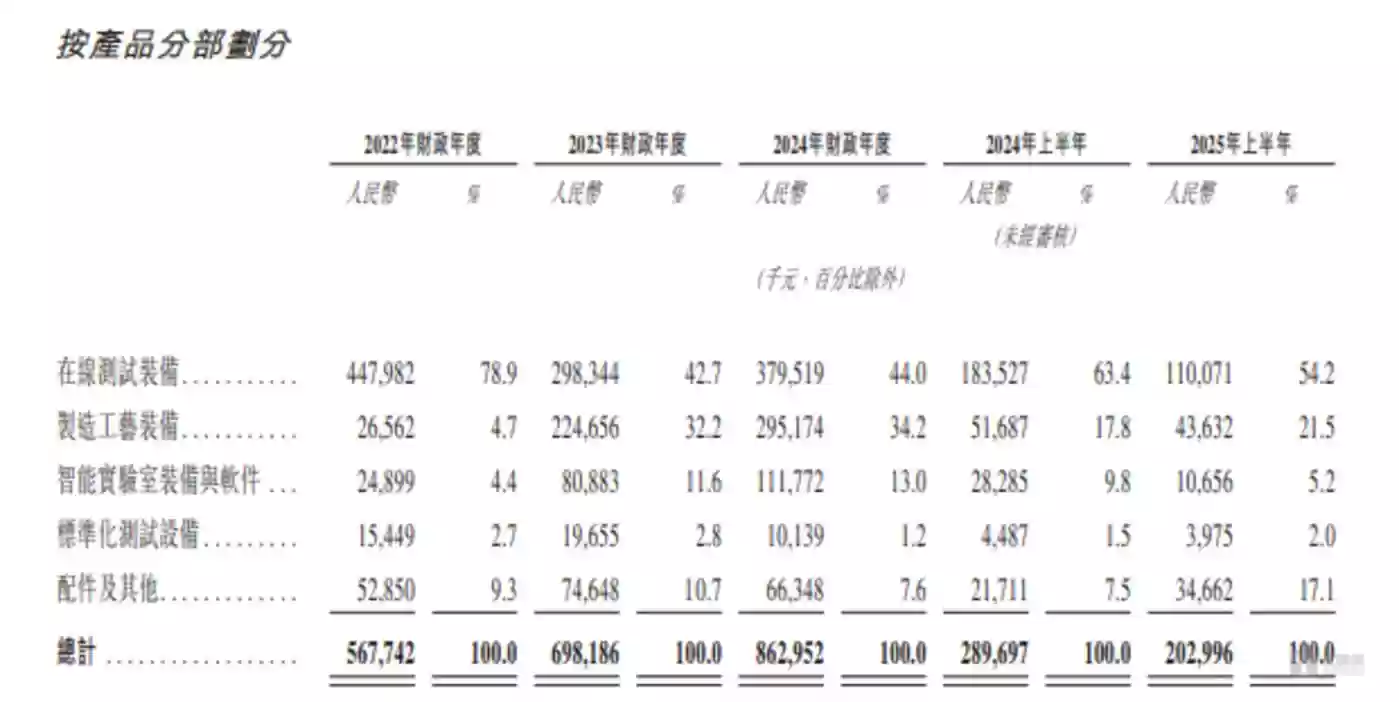 其中在线测试设备产生的销售收入分别为4.48亿元、2.98亿元、3.80亿元、1.10亿元,分别占当期营业收入的78.9%、42.7%、44%、54.2%。尽管该产品收入存在一定波动,尤其是第二期较第一期明显下滑,但后续逐步回升,且始终保持着营收占比超40%的核心地位,是支撑公司业务的关键支柱。