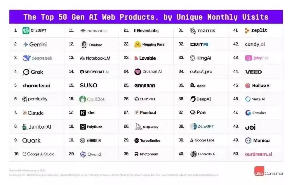 与之形成对比的是,全球AI应用市场上,众多细分赛道则相对活跃。从A16Z最新发布的一份《全球百款AI消费者应用榜单》第五版可见,除了几个“老面孔”覆盖了几乎所有高频场景——学习、陪伴、设计、生产力、社区等作为“黑马”的几款产品来自不同的领域。比如主打氛围编程的Lovable 直接冲到第 22 位,Suno首次把音乐生成带入主榜。