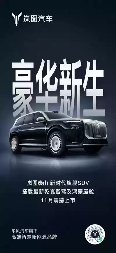 大六座SUV市场正迎来格局重塑的关键时刻,多个车企在高端赛道展开激烈角逐。岚图汽车正式宣布,全新旗舰SUV岚图泰山将于11月正式推向市场。这款被寄予厚望的新车将搭载华为最新智能驾驶技术,目标直指50万级豪华SUV市场。
