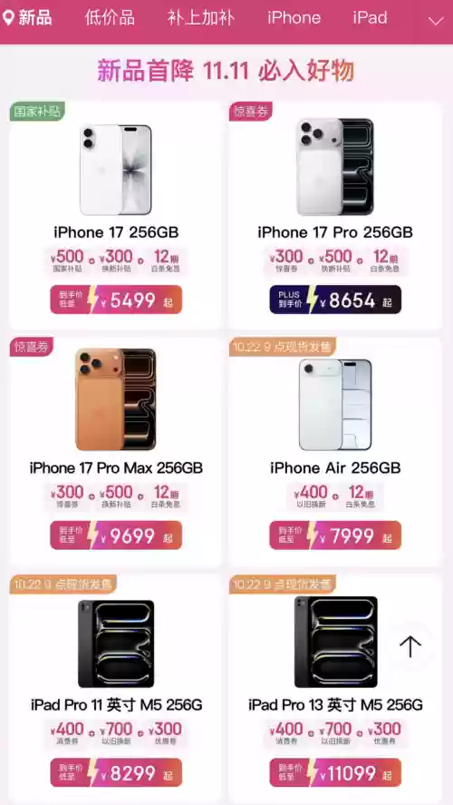 除了iPhone,iPad、MacBook、Apple Watch、AirPods等全线产品也都有专属优惠。其中,iPad Pro 11英寸M5 256G版可领400元消费券,还能享受以旧换新至高补贴700元、12期免息分期福利,到手仅需8599元;iPad 128G WLAN版限时直降200元,国家补贴后到手价低至2599元起;iPad Air 128G WLAN版限时直降1400元,叠加500元国家补贴后仅需3199元起;MacBook Pro 14 M5 16G 512G版,部分地区可享国家补贴立减2000元,还能叠加1500元以旧换新补贴,到手价低至12999元;MacBook Air M2 24G+512G版限时直降3200元,还可享受20%国家补贴及12期免息分期,国家补贴后到手价低至5190.84元;Mac mini M4 16G 256G版国家补贴后到手价低至2670.84元起;Apple Watch S11 GPS 42mm版可享限时直降、国家补贴及政府消费券优惠,到手价低至2699元起;AirPods Pro(第三代),PLUS会员下单可享9折专属福利,到手仅需1709.1元起。