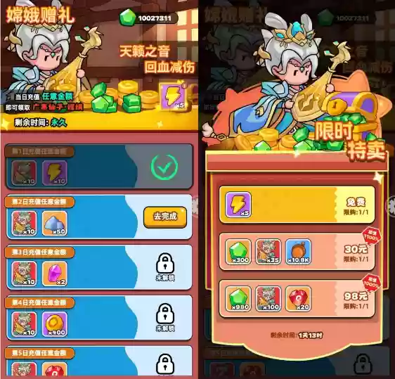 1、每日充值任意金额即可领取相应奖励,其中包含妲娥的碎片或完整角色。