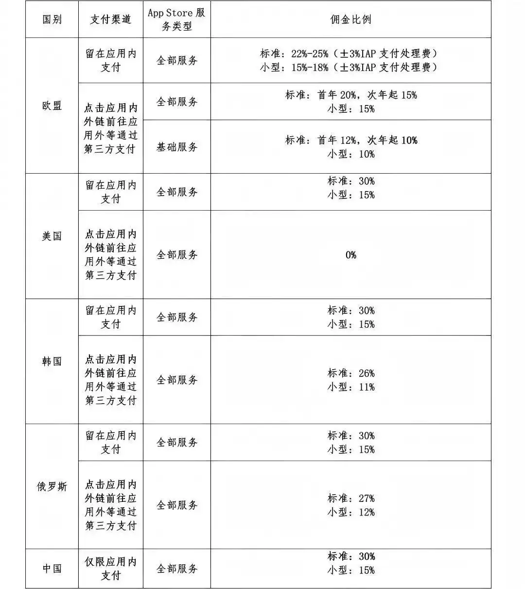 图表|基于王琼飞律师整理的苹果支付渠道及佣金政策对比,根据苹果开发者正式信息整理。