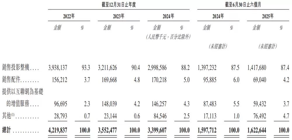 按产品类型划分,极米科技主要从事研发、生产及销售投影整机(包括长焦投影仪、短焦投影仪及创新投影仪等)、配件(支架、屏幕、无线条形音箱等)及提供与上述产品相关的互联网增值服务。其中,投影整机业务是公司主要收入来源。2024年至2027年上半年,该业务收入分别为39.38亿元、32.12亿元、29.99亿元和14.18亿元,占营收比例分别为93.3%、90.4%、88.2%和87.4%。虽然该业务收入规模持续下滑,但仍是支撑公司营收的核心力量。