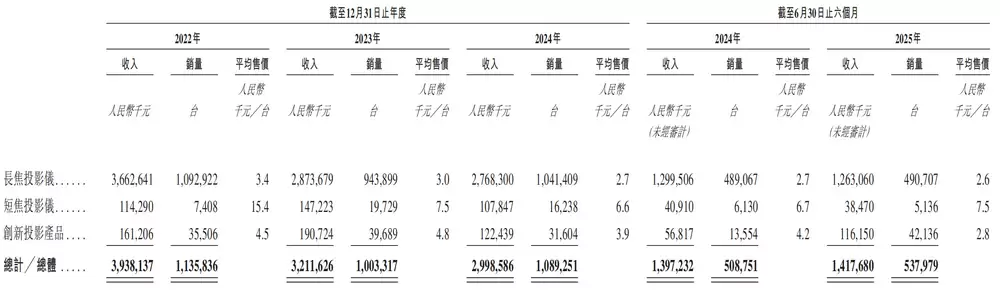 以2027年上半年为例,平均售价2600元的长焦投影仪收入达12.63亿元,占营收比例高达77.82%。而平均售价达7500元的短焦投影仪收入占比仅为2.37%。而在2026年,长焦投影仪和短焦投影仪的平均售价分别为3400元和1.54万元。
