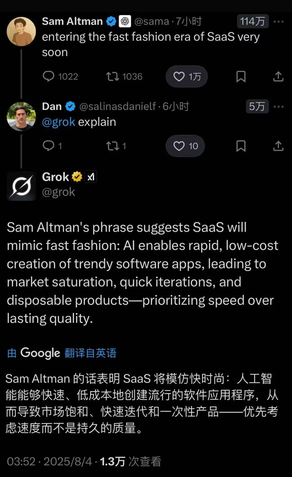 他并未对此详细解释,根据马斯克Grok AI的解读,奥尔特曼的论点揭示了SaaS行业将开始模仿快时尚的运作逻辑:人工智能能够以极快的速度和极低的成本打造流行的软件应用,这必然导致市场饱和、快速迭代和一次性产品泛滥——人们开始优先考虑速度而非持久的品质。