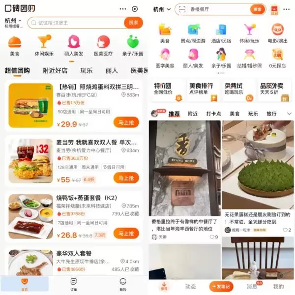 大众点评依托海量用户评价、商户评分和达人探店内容构建消费决策链,形成了强社交属性的团购生态。其页面设计也包含大量图文内容。