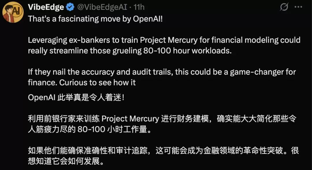 媒体报道称,OpenAI通过"Mercury"项目,以外部协作模式招募了上百名资深投行从业者和顶尖商学院在读生,为其训练专业财务模型。