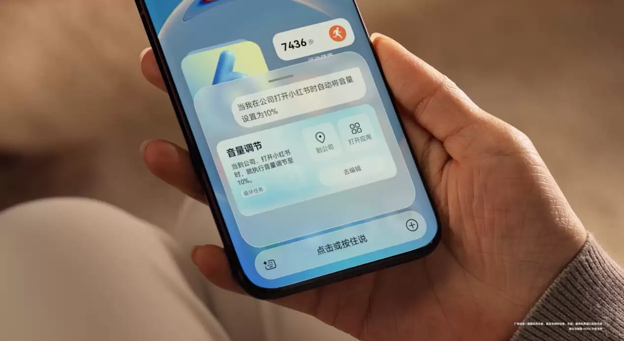 不仅如此,那些容易被遗忘的周期性生活琐事,小艺也能轻松搞定。比如,当您对小艺说:"当我在公司打开小红书时自动将音量设置为10%",任务下达后,当小艺感知到用户处于公司范围内并打开使用小红书时,将自动帮用户将音量调整到10%。