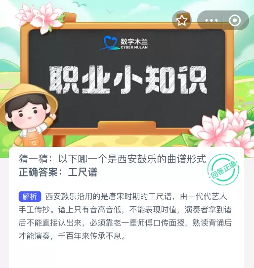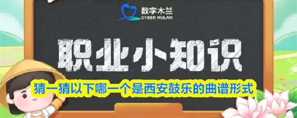 猜一猜:下列选项中哪个是西安鼓乐所使用的曲谱形式?【蚂蚁新村每日一题】2025年10月22日题目现已公布!坚持参与答题,积累木兰币,即可加速小镇建设进度。回答正确本题,立刻获得“产速+3/时”的加速奖励!今天的正确答案是【工尺谱】。西安鼓乐沿用的是唐宋时期流传下来的工尺谱,以手抄方式由历代艺人传承至今。