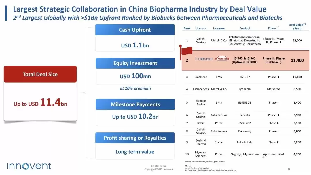 信达生物专门制作了一张PPT,呈现全球前十大的创新药交易。在这张图表中,这笔114亿美元总交易额的合作仅次于第一三共在2024年一笔220亿美元的交易。