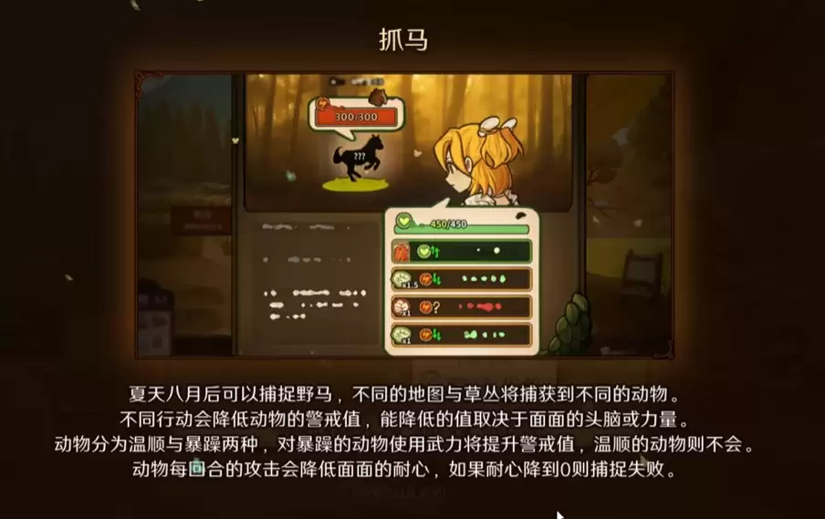 寻猎的具体位置在野马湖,想要开启这个玩法需要满足几个核心条件:首先女儿年龄需要达到14岁,其次游戏内时间必须是8月份。当8月到来后会触发修建马厩的剧情,待马厩建成后,野马湖的入口才会正式开启。任务开启后,小伙伴们就能带着女儿前往野马湖捕捉野马了。每次捕马会消耗5点体力,而捕捉方式也相当简单,玩家需要根据角色属性找到对应NPC并触发选项,随后在野马奔跑过程中,运用自己的技能将野马的血量降至零。