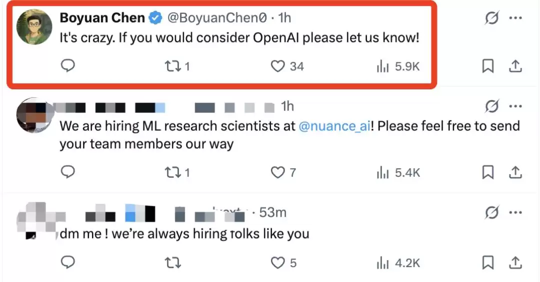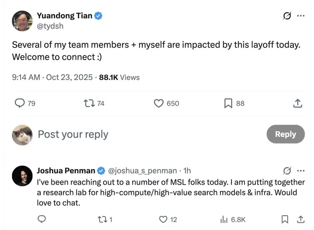 田渊栋的发文评论区迅速成为"招聘现场",美国风投公司South Park Commons创始人Joshua Penman直接发出邀请,称正在组建相关实验室;OpenAI研究员Boyuan Chen也留言感叹"这太疯狂了",并鼓励田渊栋考虑加入OpenAI。