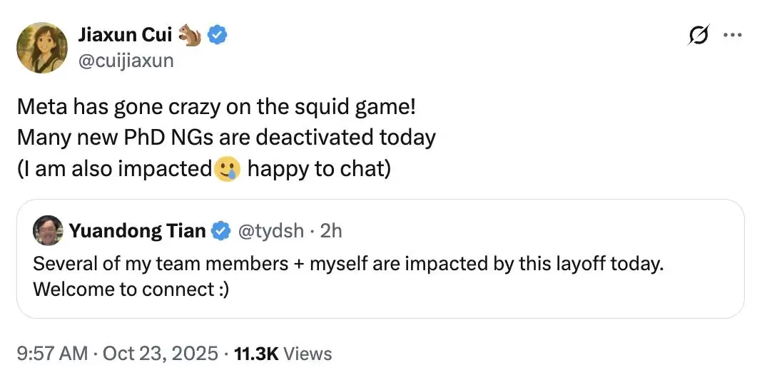 除了田渊栋,成批的华人AI研究员都受到了影响。本科毕业于上海交通大学的华人研究员Jiaxun Cui在社交平台X上表示:"Meta为鱿鱼游戏疯狂!今天很多新入职的毕业生都被停用了(我也受到波及,很期待进一步交流)"