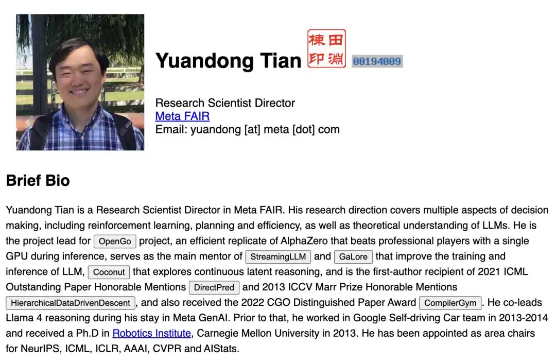 田渊栋是AI领域的重要华人研究者、科幻作家。他于2013年从美国卡内基梅隆大学机器人研究所博士毕业,2016年加入Meta人工智能部门担任研究科学家,研究方向涵盖强化学习、规划与效率以及对大型语言模型的理论理解,曾参与领导OpenGo项目研发和Llama 4推理等工作,获得过2024年ICML杰出论文荣誉提名和2024年CGO杰出论文奖等重要奖项。此外,他还撰写了硬核长篇科幻小说《破晓之钟》。