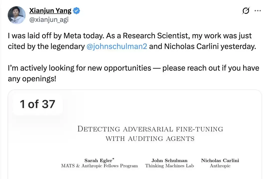 研究员Xianjun Yang发文称:"我今天被Meta解雇了。作为一名研究科学家,我的论文昨天刚被传奇人物@johnschulman2和Nicholas Carlini引用。我正在积极寻找新的机会——如果您有任何空缺,请联系我!"