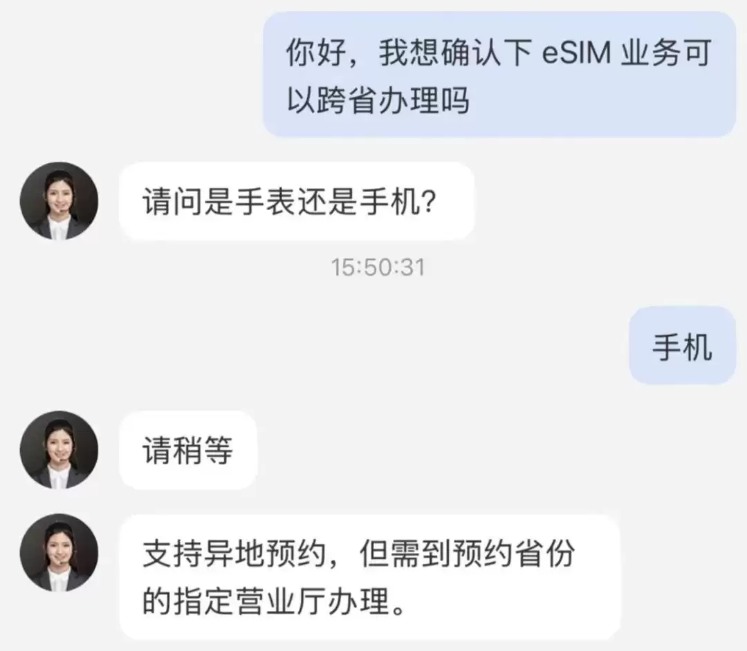 中国电信方面,我们通过移动客户端线上咨询客服后了解到,中国电信支持跨省办理 eSIM 号卡携转业务,但需要在预约之后,前往预约省份下运营商指定的营业厅才可办理。