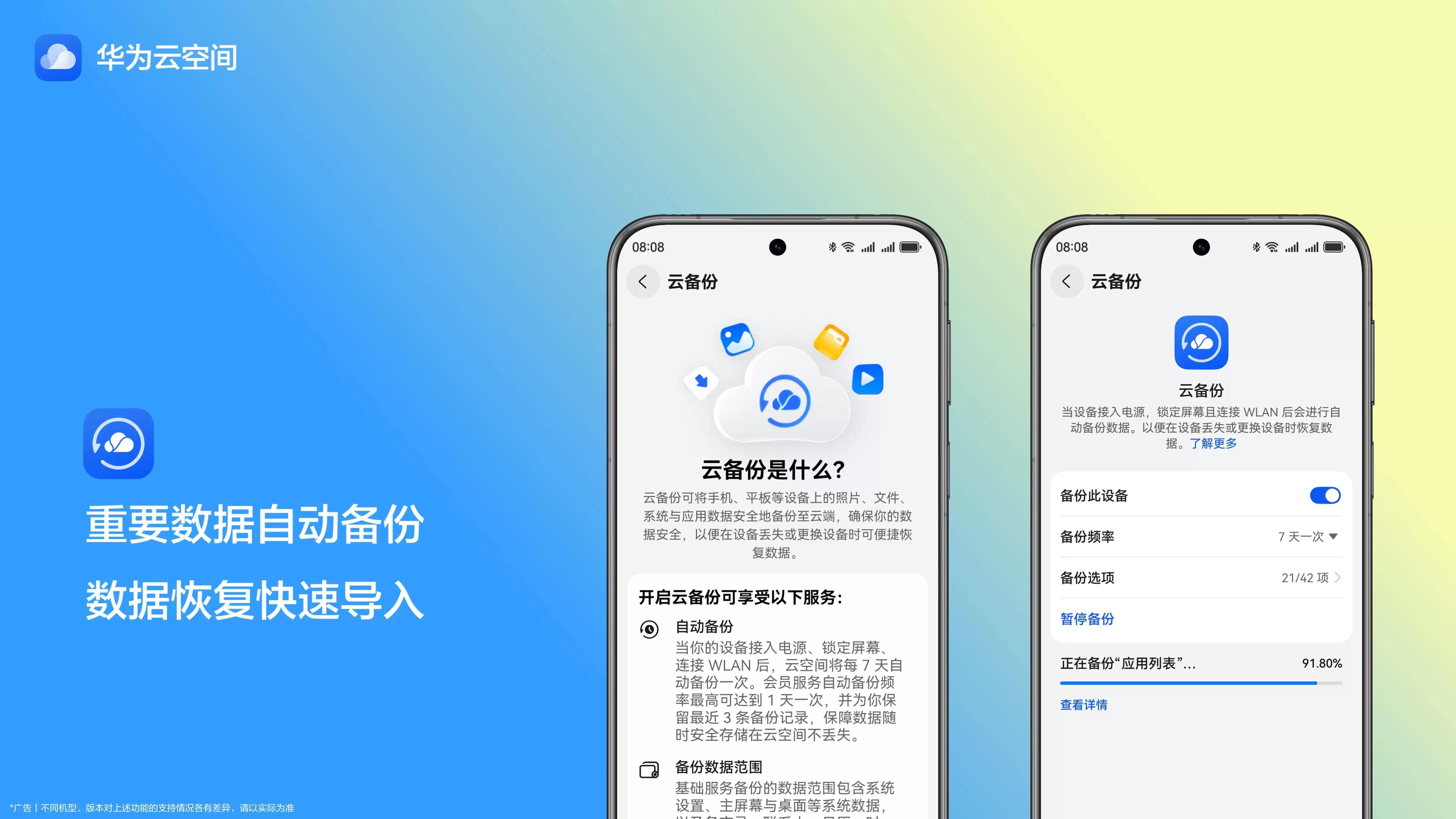 “云备份”功能旨在为设备数据建立云端副本。开启后,当设备处于充电、锁屏且连接WLAN的状态时,华为云空间会定期自动完成数据备份。依托多副本冗余存储技术,确保云端备份数据安全无虞。无论是换机还是设备遗失,都能快速将云端数据恢复至新设备,让重要数据随时“跟隨”身边。