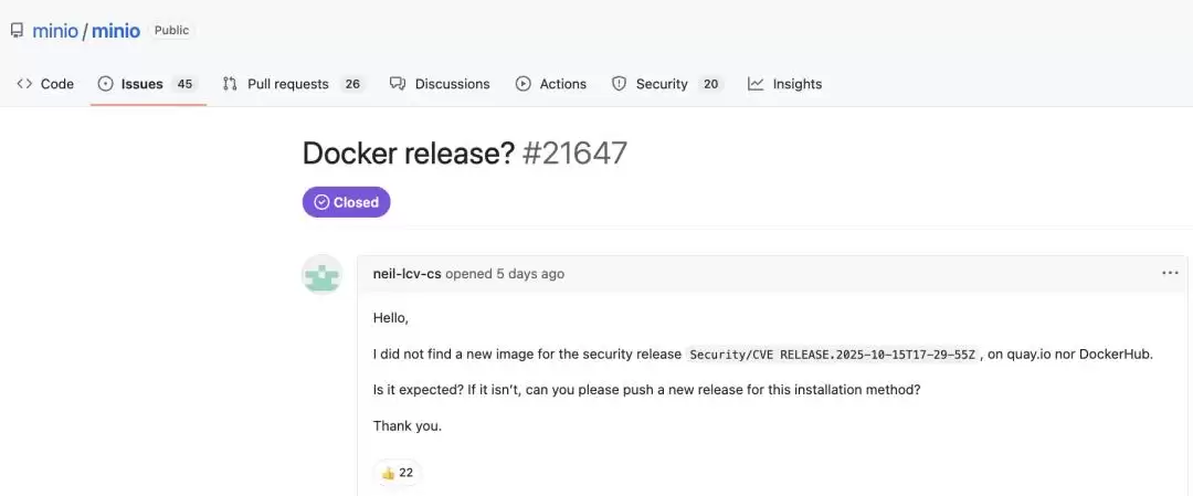 曾经被视为全球增长最快的对象存储开源系统、下载量突破百亿次的MinIO,最近在开源社区掀起了一场不小的风波。事情的起因是:MinIO在2025年10月15日发布了针对安全漏洞的CVE合规版本,但部分用户在DockerHub和Quay.io上却找不到最新镜像,只能在GitHub上提问:“新镜像去哪了?”