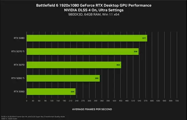 从实际测试来看,《战地6》对显卡的要求并不高,RTX 5060即可在1080P分辨率下实现60帧稳定运行;如果选择2K分辨率,RTX 5070还能保持144Hz的电竞高刷新率,4K分辨率下也能保持流畅;而在4K极限画质下,建议选择RTX 5080更具性价比。