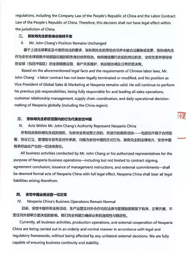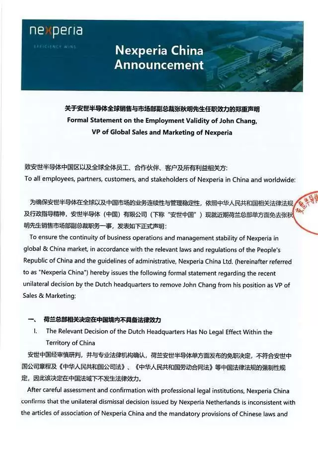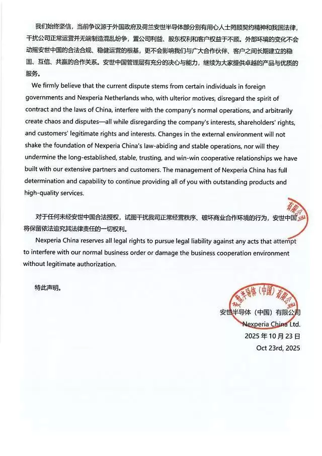 声明指出,为确保安世半导体在全球及中国市场的业务连续性与管理稳定性,公司严格依照中华人民共和国相关法律法规及行政指导精神,现就荷兰总部单方面免除张秋明先生销售市场部副总裁职务一事发表如下正式声明:第一,荷兰总部相关决定在中国境内不具备法律效力;第二,张秋明先生职务身份保持不变;第三,张秋明先生职权范围内的行为代表安世中国;第四,安世中国业务运营一切正常。目前,安世中国所有业务活动、生产运营及对外合作均在法律与管理制度的框架下有序、正常开展,不受任何外部单方面决定的影响。我们完全有能力确保业务的连续性与稳定性。