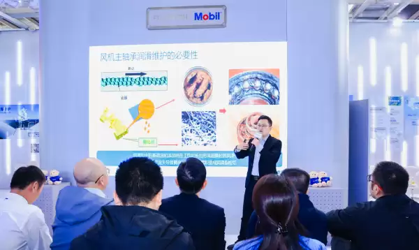展会期间,埃克森美孚中国高级技术经理程良在现场主持举办了主轴承润滑管理服务研讨会,分享了美孚全新升级的风机主轴承润滑维护方案。该方案依托美孚力富TMSHC 007主轴承维护产品,可在风机主轴承的正常运行中,有效软化旧滑脂并持续提供可靠的抗磨保护,实现高效专业维护。同时,埃克森美孚中国还提供了智能化、集成化的专业维护设备,支持手机远程操控,可实时监测与报警提醒,显著提升运维效率与安全性。