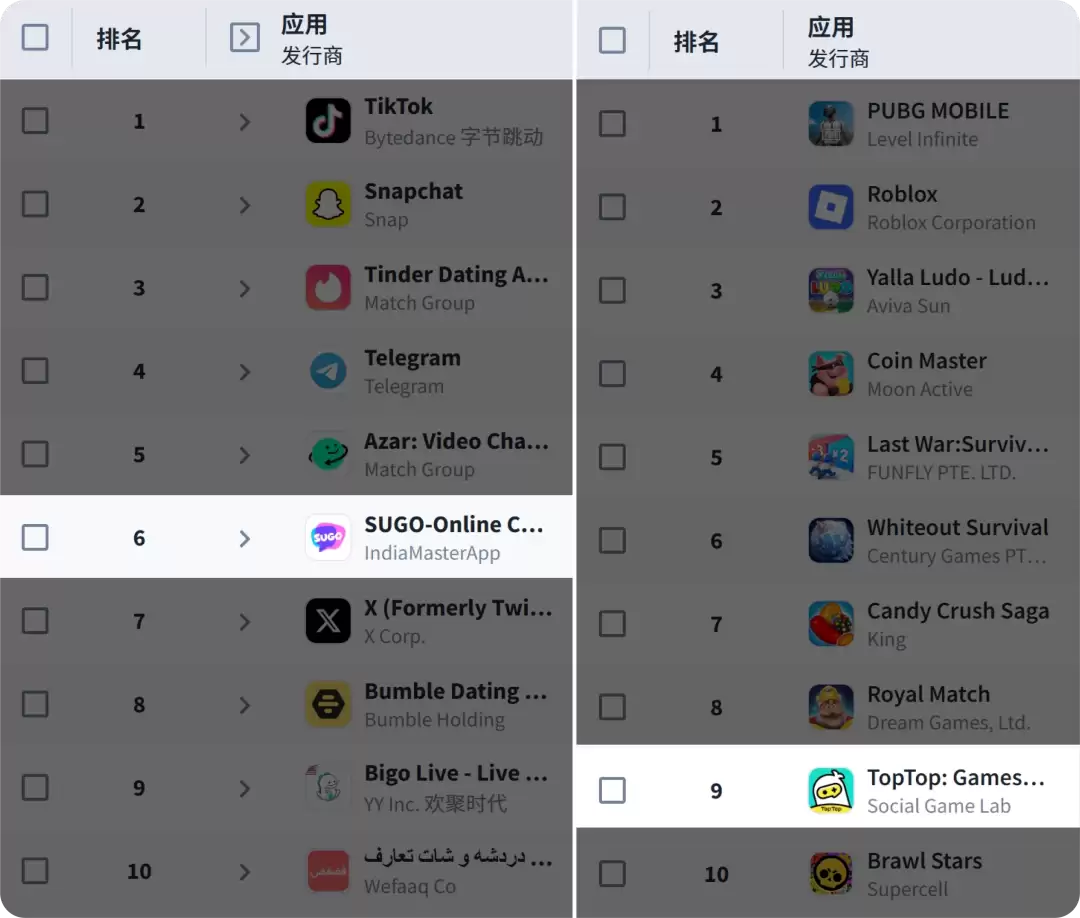 根据Sensor Tower数据,2025年1月至9月,SUGO在中东地区社交网络应用收入排行榜中位列第六,TopTop则位列中东地区Google Play游戏应用收入排行榜第九。